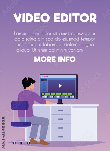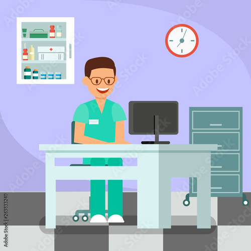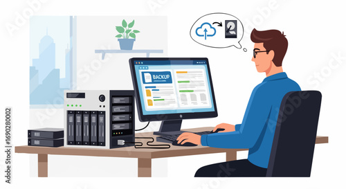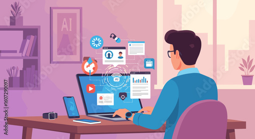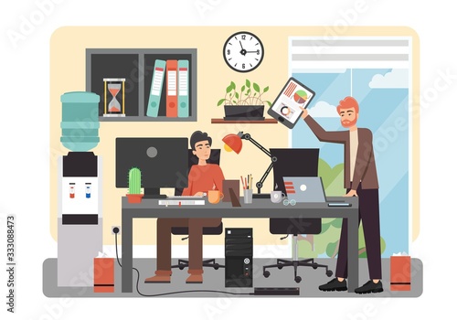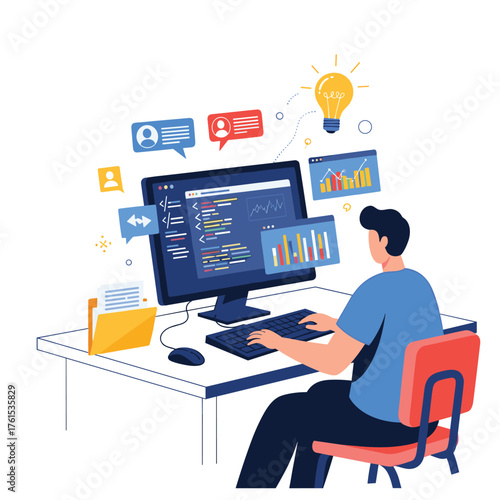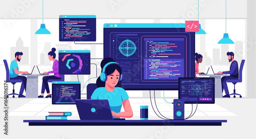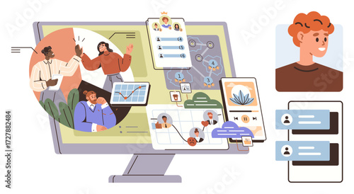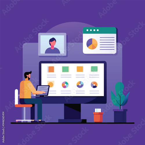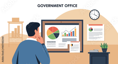 Vector security service police worker sitting control room front of monitors displaying video from surveillance cameras cartoon illustration. CCTV and computer system concept