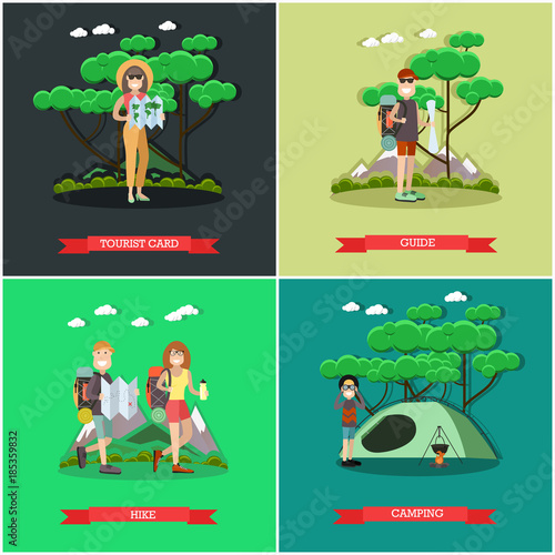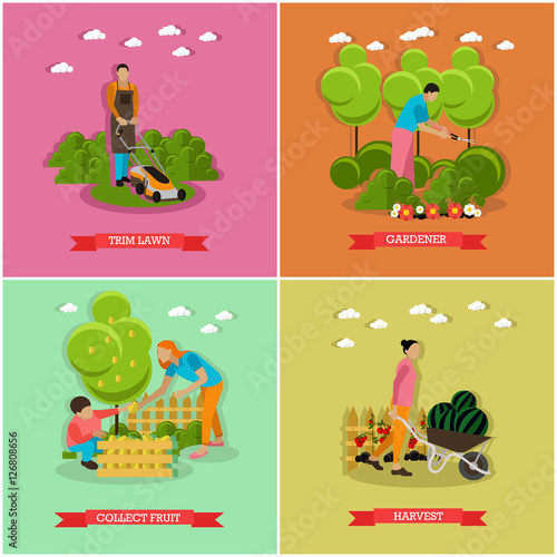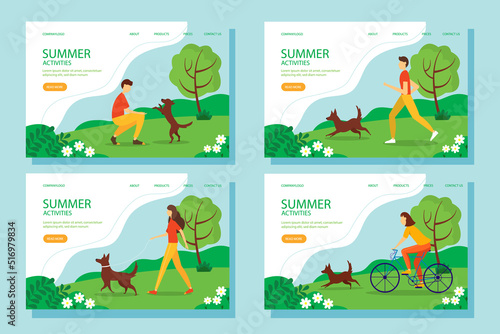 Vector set of aged people posters. Provision, walking dog, Relaxes and Grandmother flat style design elements.