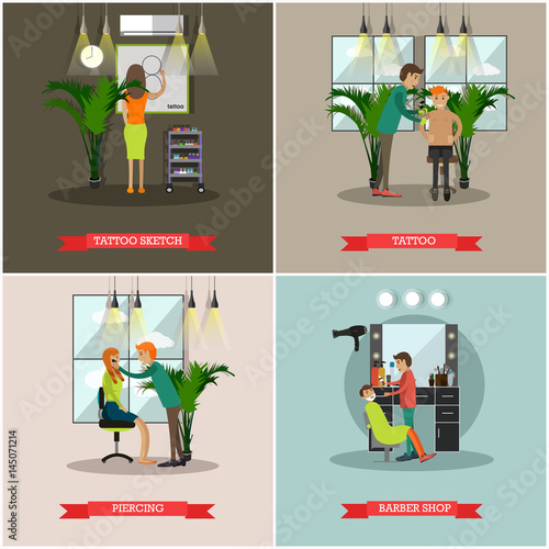 Vector set of airport concept posters, banners. Stewardess, Taxi, Tickets and Travellers design elements in flat style.