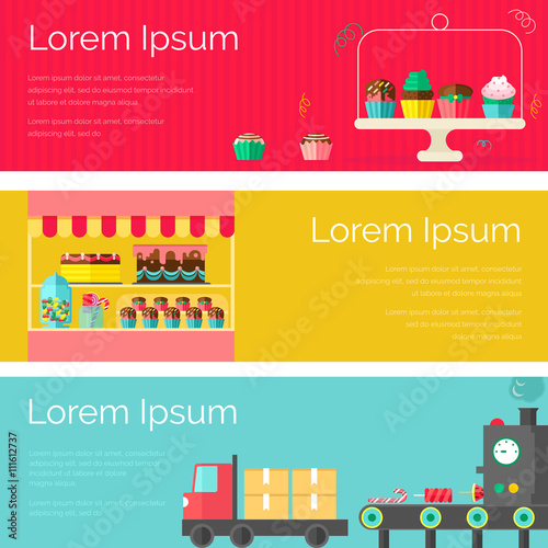 Vector set of amusement park concept horizontal banners. Amusement park, Entertainment, Sweets in the park design elements in flat style.