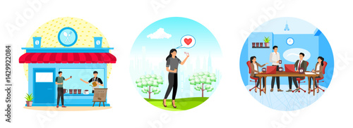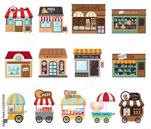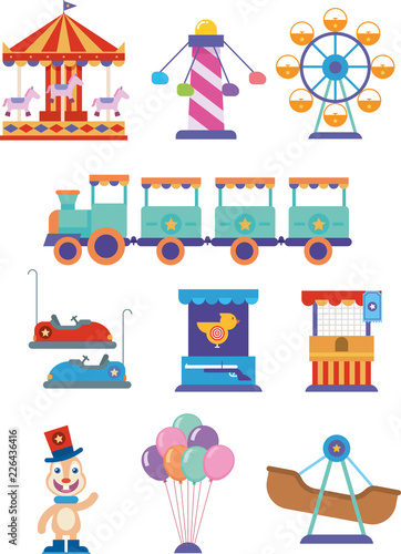 Vector set of amusement park design elements, icons in flat style. Kids with their parents, having rest, buying cotton candy, ice cream and hot dog. Street food truck, stall, kiosk. Shooting range.