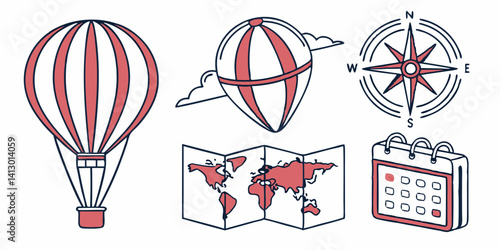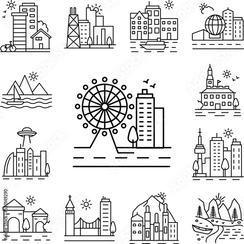 Vector set of amusement park isolated icons and objects. Black and white amusement park symbols and design elements. Attractions, carousel, wheel, ice cream cart.