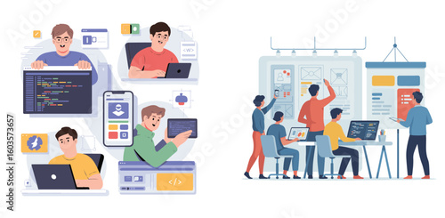Vector set of banking concept design elements, icons in flat style. Customers carrying out operations with ATM, self-service terminal. Bank employees, guard, safe, cash box, encashment truck.