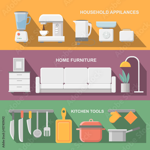 Vector set of horizontal banners with interior design bathroom, furniture and accessories for bath, place for text, flat style.