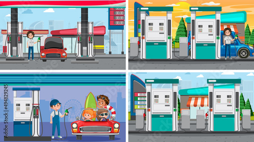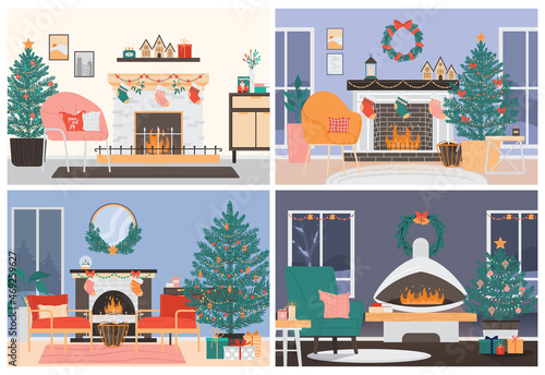 Vector set of banners with restaurant interiors. People having lunch in cafe. Kitchen, dining room and cafe.