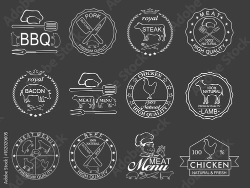 Bike rental badge label logo set. Vector monochrome illustration in retro style. Bicycle rent, shop and repair typography.