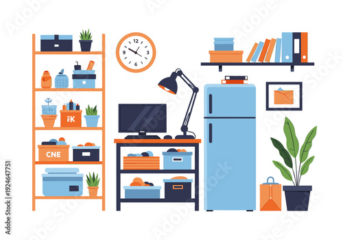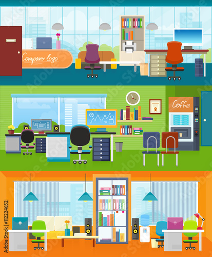 Vector set of business posters, banners. Modern office space interior with office furniture and equipment. Flat style design.