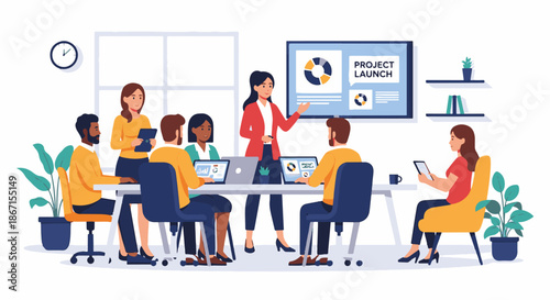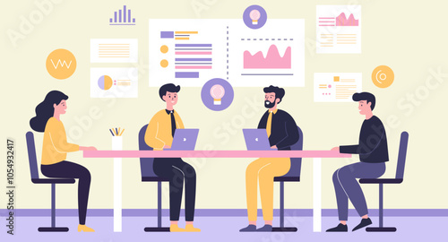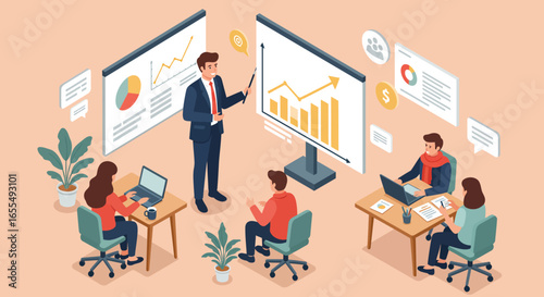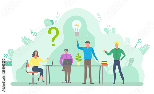 Vector illustration of office people giving presentation, working on computer at workplace. Business people, symbols, icons isolated on white background. Flat style design elements.