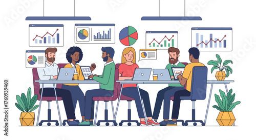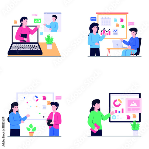 Vector illustration of office people giving presentation, taking part in conference and workshop, making a deal. Business people, symbols, icons isolated on white background. Flat style design.