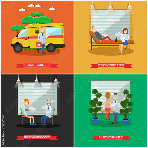Vector set of car service station, repair shop posters, banners. Auto inspection, Tire, Changing a wheel and Engine repair concept flat style design elements.