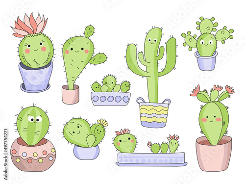 Vector set of cards with cute cacti succulent plant and inspirational quotations. Blooming cartoon cactuses with funny faces in pots on color background with dots, hearts, stars, party pennants.