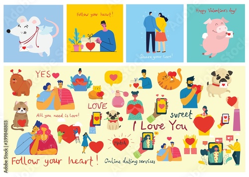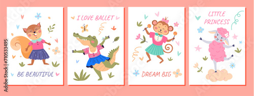 Vector set of party flags, notepad sheets with cute animals enjoying ice skating and winter quotations. Funny little raccoon fox squirrel bear owl and rabbit having fun in winter.