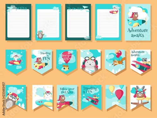 Vector set of cards, flags, notepad sheets with pilot animals and inspirational travel quotes. Cute raccoon fox squirrel bear deer and rabbit owl hedgehog flying on airplane, hot air balloon, balloons