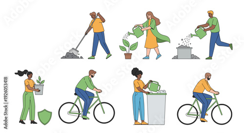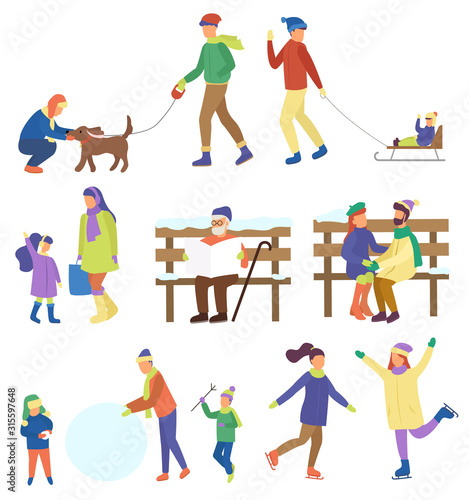 Vector set of cartoon characters isolated on white background. People in park design elements and icons in flat style. Jogging, riding bicycle, walking out dogs.