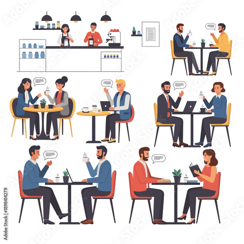 Vector set of cartoon characters isolated on white background. People in restaurant design elements and icons in flat style. Restaurant waiters employees and visitors.