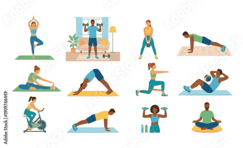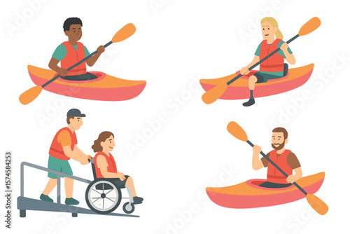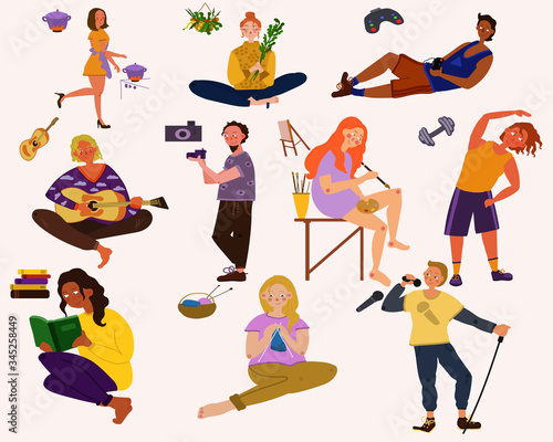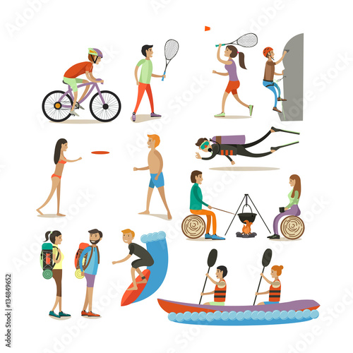 Vector set of characters, summer outdoor activities concept design elements, icons, isolated on white background. Flat style design.