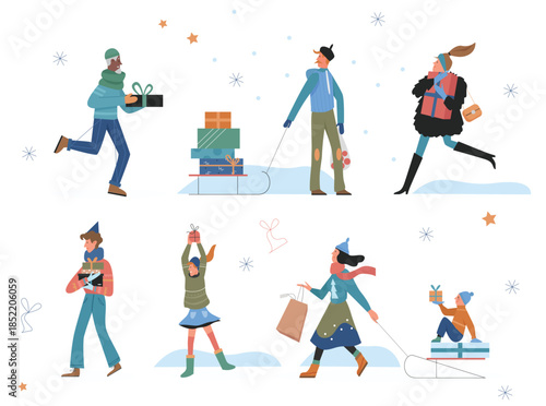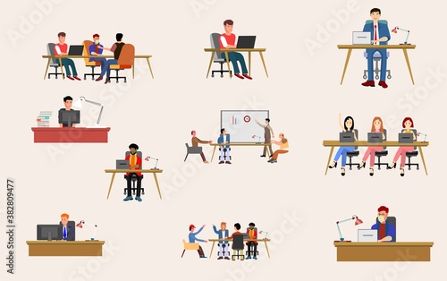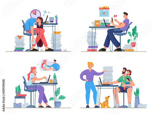 Vector set of city park situation illustrations. Woman and man characters walking in a park, work with laptop on a bench, reading book in hammock, walk with bicycle. Urban summer.