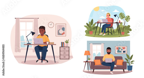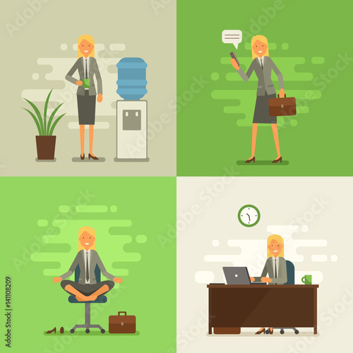 Vector illustration of successful director with cup of coffee, saleswoman serving coffee to go to customers. Coffee house people symbols, icons isolated on white background. Flat style design.
