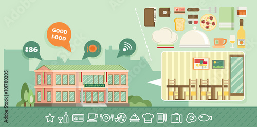 Vector set of coffee shop, coffee house, cafe interior, street cafe concept design elements, posters, banners in flat style.