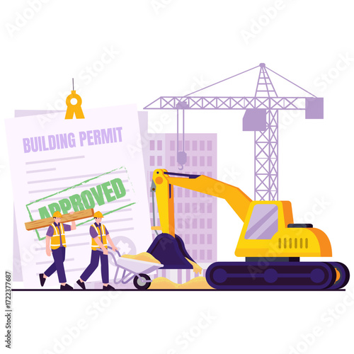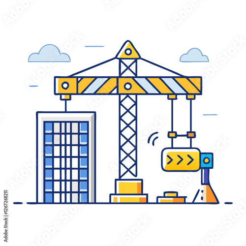 Vector set of construction site objects and tools isolated on white background. Construction building equipment icons in flat style. Crane, bricks, sign, concrete mixer.