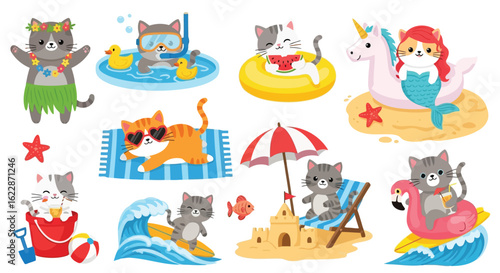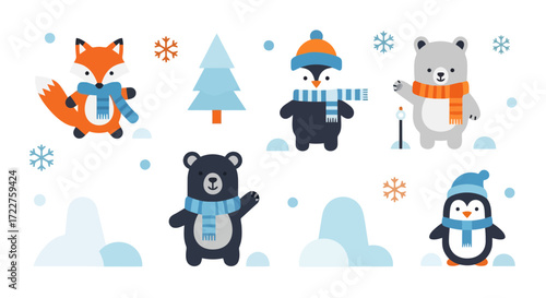 Pirate icon set. Vector illustration of cute animals panda, raccoon, fox in pirate hats, ship with pirate flags, jellyfish with eye patch and other marine items isolated on white background.