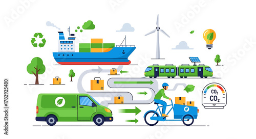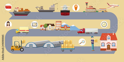 Vector set of delivery vehicle concept design elements in flat style. Delivery by plane, by ship, by truck. Removal of goods from warehouse by forklift. Logistics transportation.