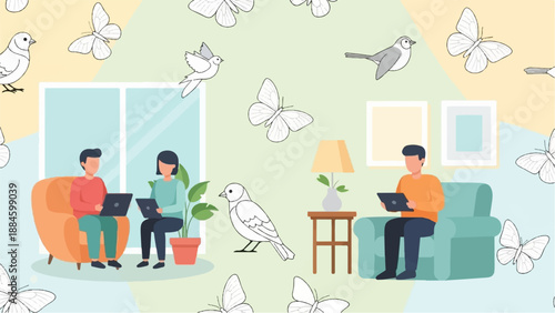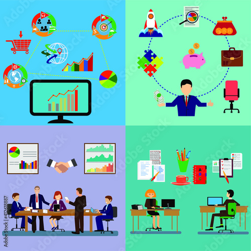 Vector illustration of mother cooking in kitchen, father with ball watching football on tv and children playing games and doing homework. Family people flat symbols, icons isolated on white background