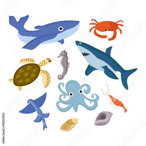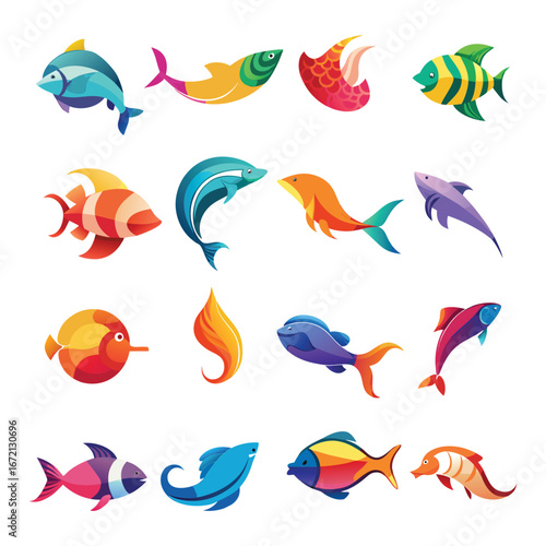 Vector set of bright color fish icons isolated on white background. Flat style design elements.