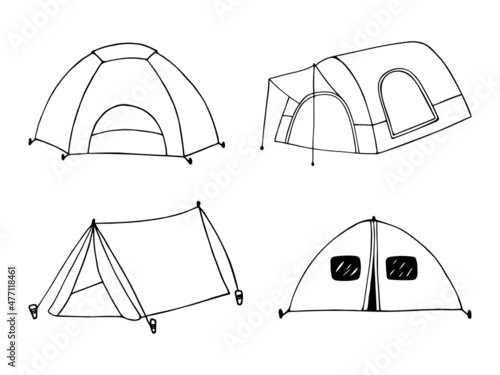 Vector set of fishing objects isolated on white background. Design elements and icons. Fishing rod, boat, tent, boots, hooks.