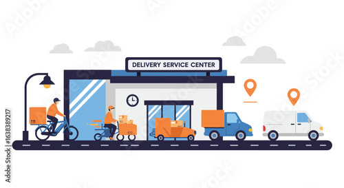 Vector set of food delivery posters, banners. Couriers delivering food by bicycle, truck and by motor scooter. Flower and water delivery. Flat style design.