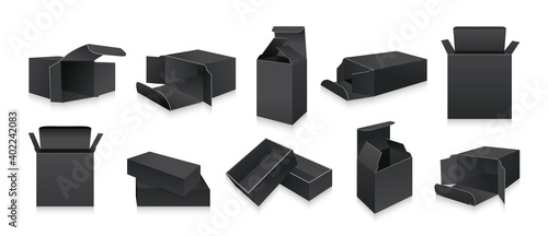 Vector set of gift black boxes with red bow and ribbon. 3D realistic objects isolated on white background. Christmas and birthday holiday decoration. Black friday sale presents.