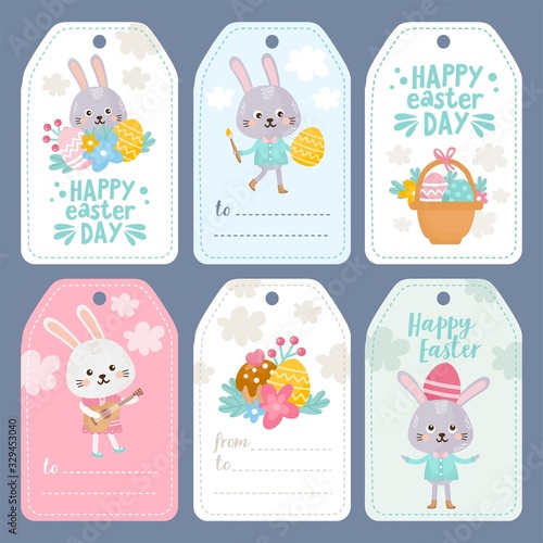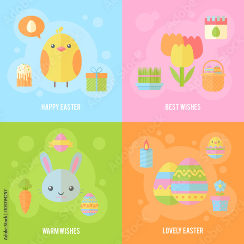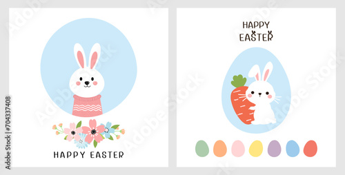 Vector set of greeting cards with Easter rabbits, paschal eggs, flowers and Happy Easter lettering. Spring holiday celebration poster design templates.
