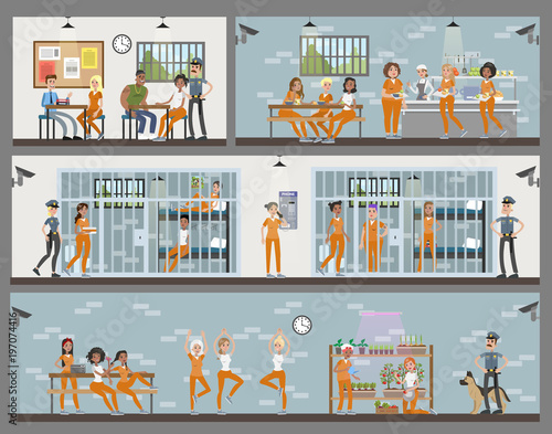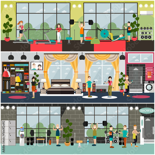 Vector set of gym posters, banners with fitness people males and females doing exercises with barbell, dumbbells, using leg press machine, treadmill. Gym equipment concept flat style design.