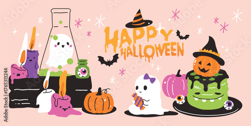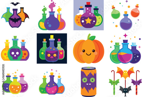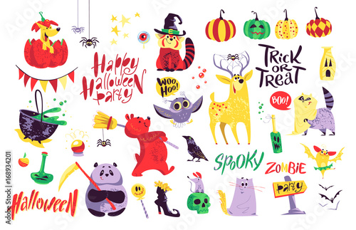 Vector set of halloween party photo booth props and masks. Halloween stickers. Icons set illustration. Pumpkin, hats, monster, skull, holiday costume elements.