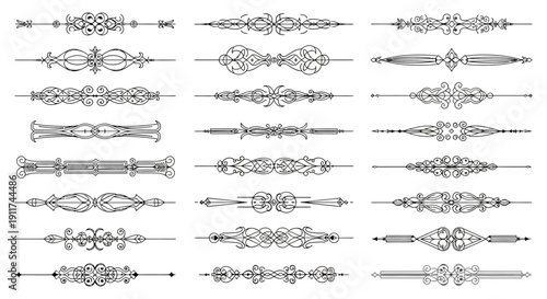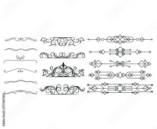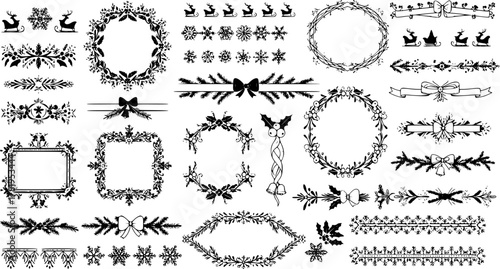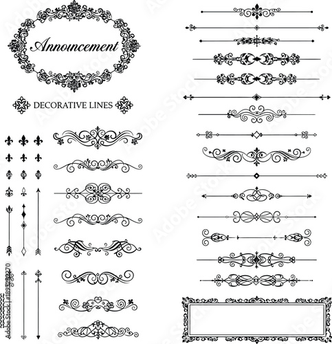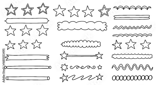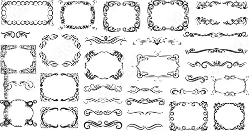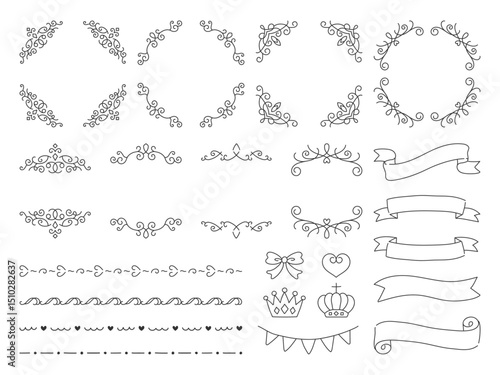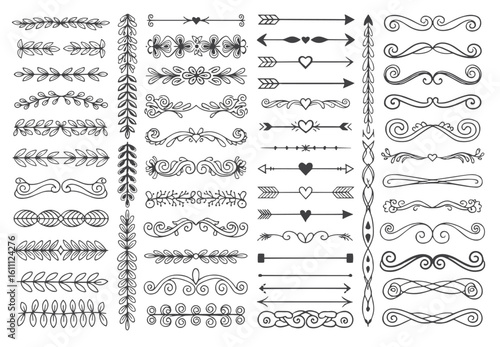 Vector set of doodle decorative symbols. Arrow, wreath, banner, border, frame, floral elements. Hand drawn illustration isolated on white background.