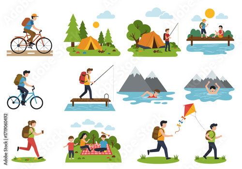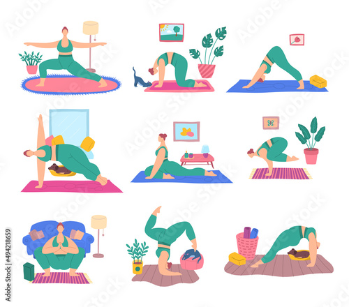 Vector set of healthy pregnancy. Morning exercise, fitness, fitball training, walk and yoga for pregnant women. Active healthcare lifestyle. Flat design