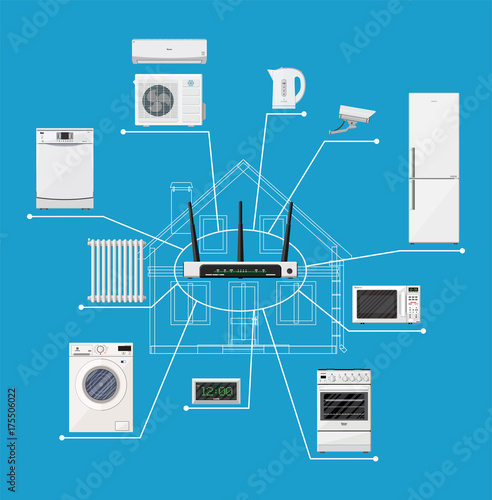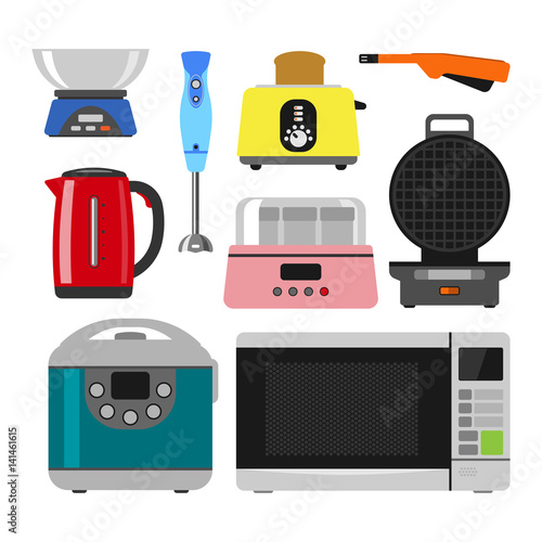 Vector set of home electronics objects isolated on white background. House appliances icons. Washing machine, vacuum cleaner, air-conditioner, tv, radiator, heater