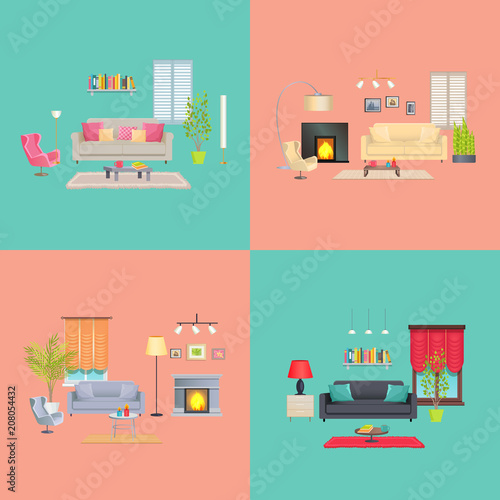 Vector set of hotel square posters. Housekeeping, Reception, Housemaid, Porter flat style design elements.