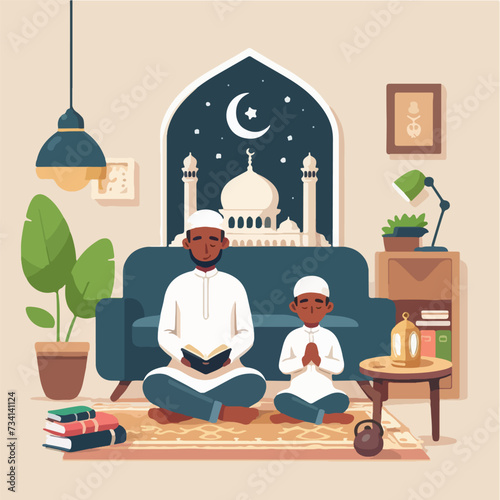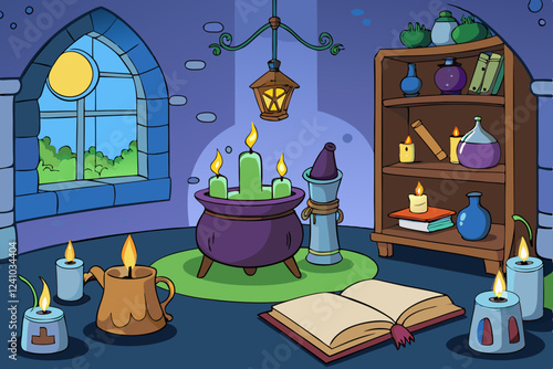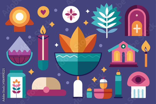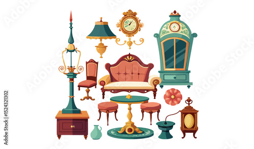 Vector set of house living room interior objects in flat style. Design elements and icons isolated on white background. Grandma sitting in chair next to fireplace.