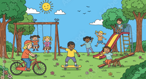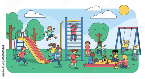 Vector set of kindergarten kids posters. Upbringer, Slide, Kindergarten and Swing flat style design elements.