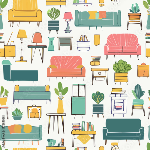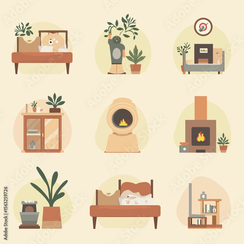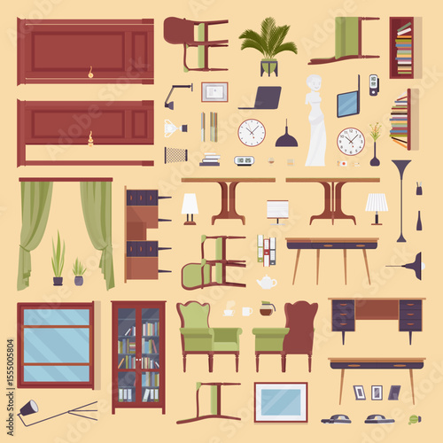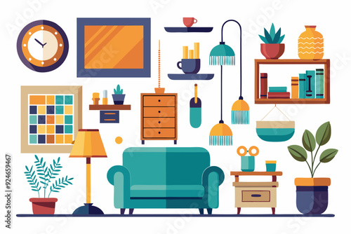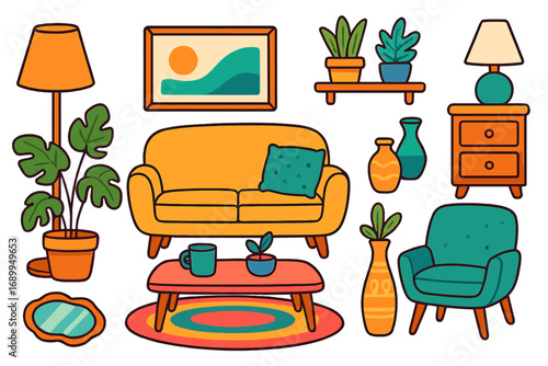 Vector set of living room accessories and furniture. Home modern interior design elements. Hand drawn isolated objects. Chair, fireplace, sofa, storage cabinet, table, shelf.
