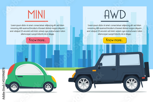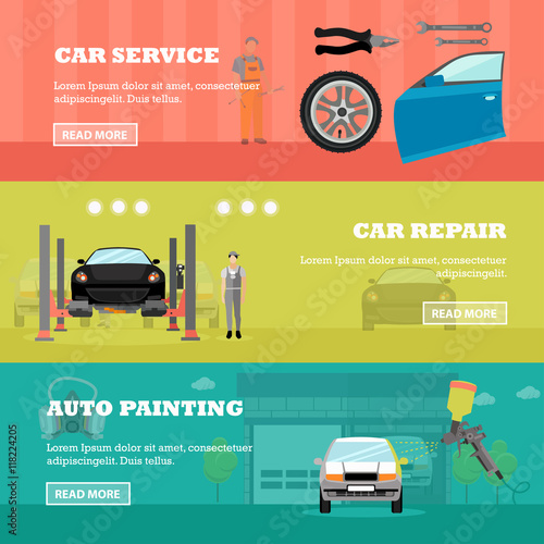 Vector set of machine workroom horizontal banners. Replacement of glass and wheel in the car, painting, Repair of motor and other items flat style design elements.