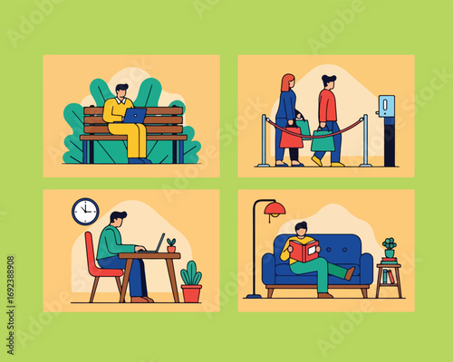 Vector set of modern gadgets for daily life concept posters, banners. Sofa, Park, Cafe, Teenager design elements in flat style.