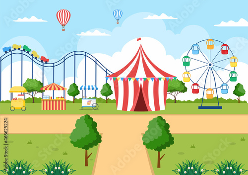 Vector set of outdoors wedding scenery posters, banners. Decorated wedding arch, tables and big cake with three tiers, piano for musicians flat style design elements.