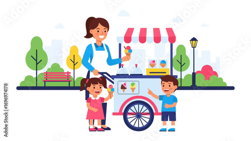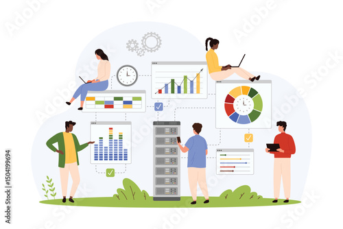 Vector illustration of cashier female, buyers families with shopping carts at grocery store or supermarket. People shopping symbols, icons isolated on white background. Flat style design.