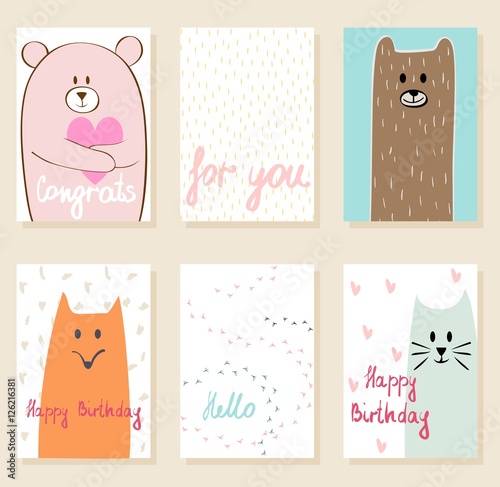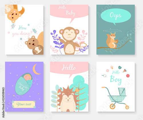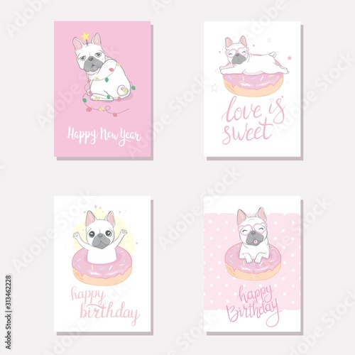 Vector set of pet grooming cards, flyers, posters with cute dogs taking bath, getting haircut, animal care accessories. Dog grooming services and supplies advertising banners.