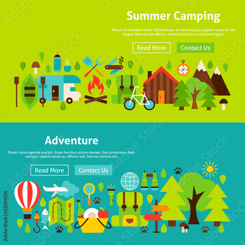 Vector set of photo, video equipment for media, travel concept horizontal banners. GoPro for travel, Interview for news, All for photos and video design elements in flat style.
