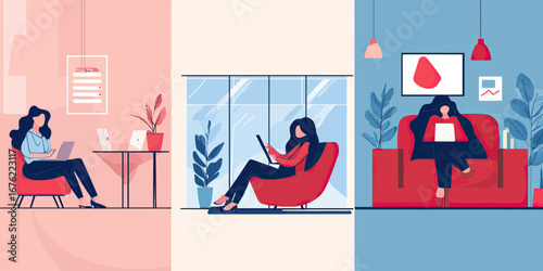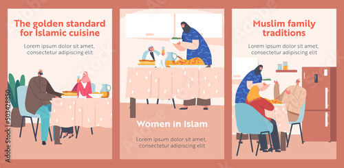 Vector set of posters with people in cafe and restaurants. Lunch, breakfast, dinner.