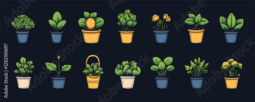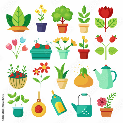 Vector set of potted house plants. Flowers and green home plants in pot. Objects for interior design. Water spray, soil, aloe, cactus.
