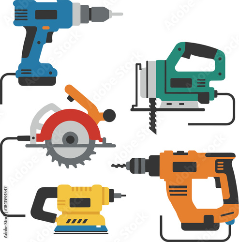 Vector set of power electric tools. Repair and construction working tools. Design elements and icons isolated on white background.